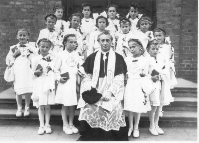 Ks. Wojciech Riedel z dziewczętami w dniu I Komunii - rok ok. 1950